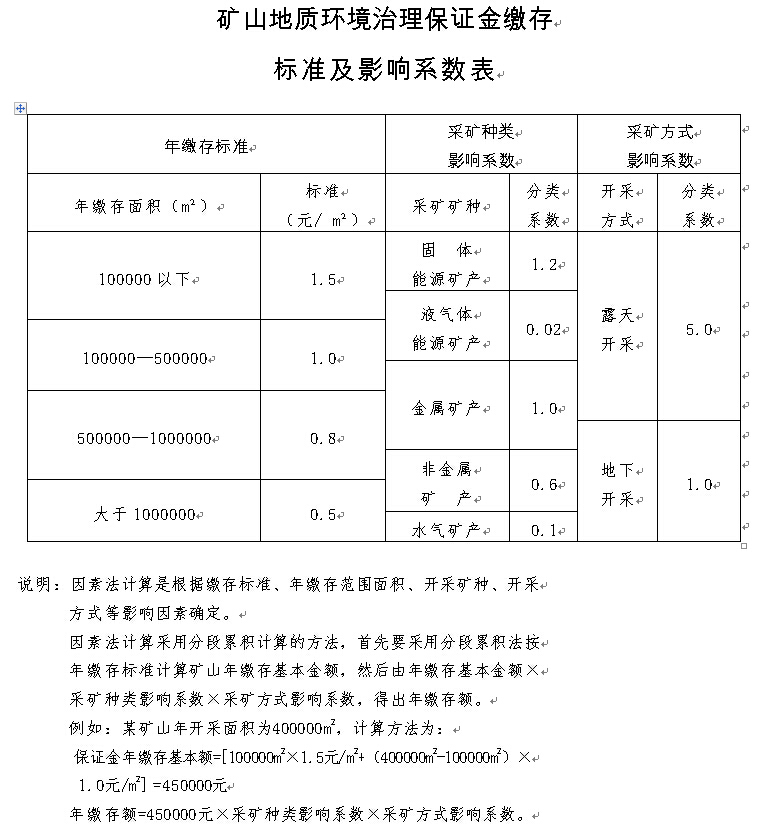 第二十六条 矿山地质环境治理保证金缴存标准应当按照不低于矿山地质环境治理费用的原则,根据本办法所附的《矿山地质环境治理保证金缴存标准及影响系数表》,以因素法计算与治理方案综合比较,按就高原则确定。